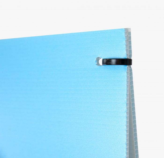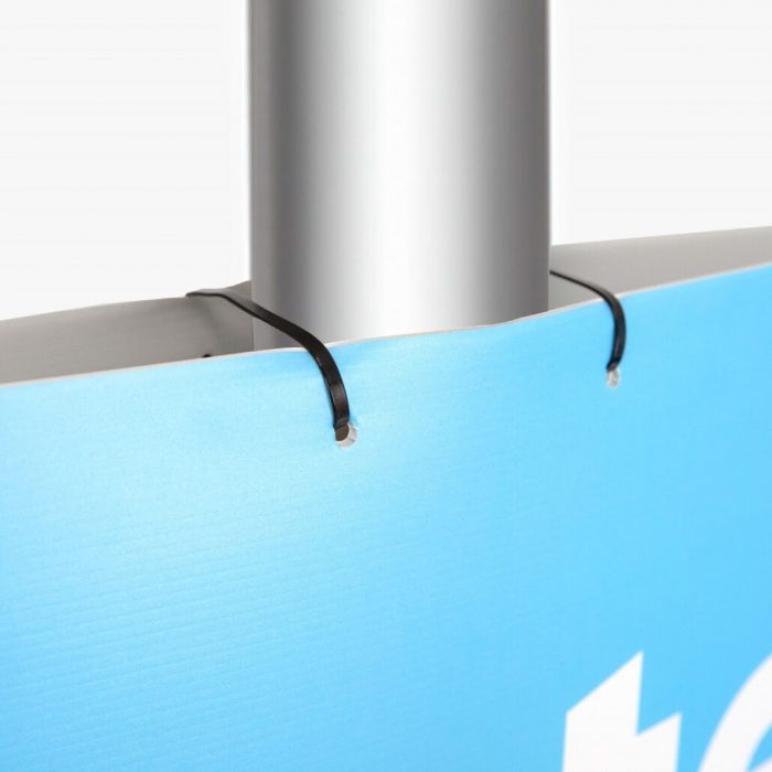 Montage is eenvoudig en snel: het paneel is ingesneden en bevat 14 gaten, zodat je het met tie‑wraps stevig rond bijvoorbeeld lantaarnpalen of ander straatmeubilair bevestigt. Door het lichte gewicht is opzetten geen probleem, maar je boodschap blijft wel stevig zichtbaar.