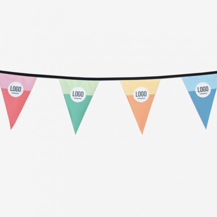 Op zoek naar een feestelijke én doelgerichte manier om jouw boodschap zichtbaar te maken? De vlaggenlijn is ideaal voor promoties, evenementen of bedrijfsacties. Dankzij de puntvlaggetjes aan een sterke band trekt je boodschap de aandacht zonder massieve constructies. Je hebt de keuze uit enkel- of dubbelzijdige bedrukking. De vlaggenlijn is 5 meter lang en bestaat uit 13 puntvlaggetjes, met 10 cm tussenruimte tussen de vlaggetjes. Beide uiteinden hebben 50 cm extra band, zodat je de lijn eenvoudig kunt bevestigen. Voor de afwerking kun je kiezen uit band in wit of zwart, afhankelijk van je design en voorkeur.